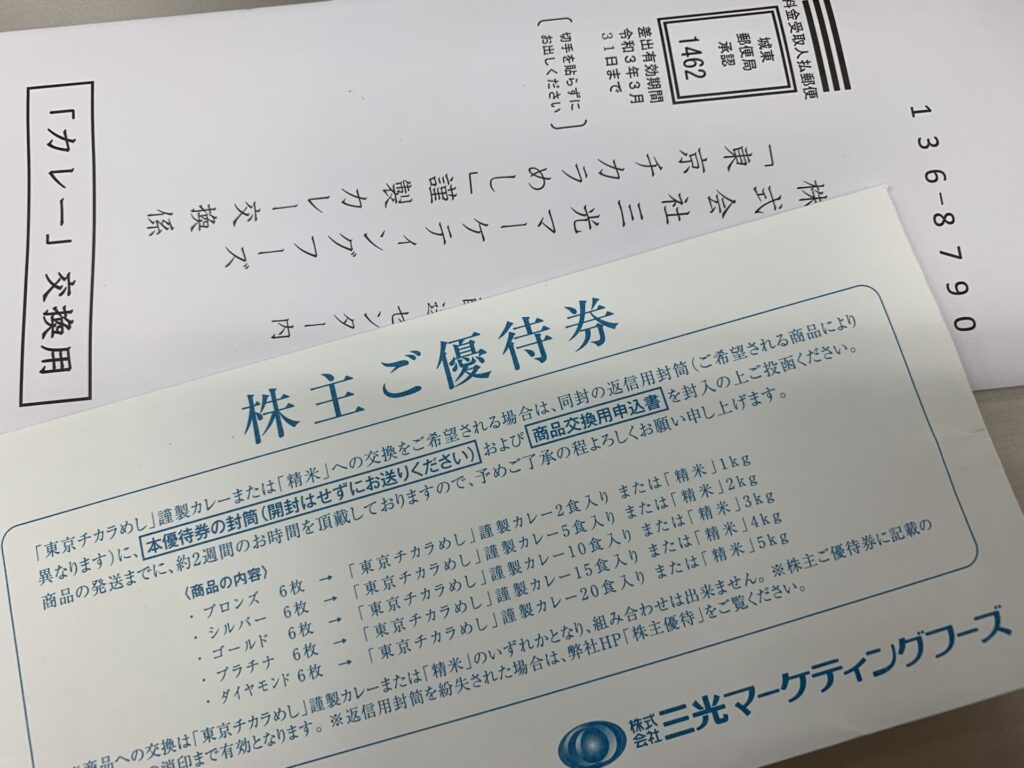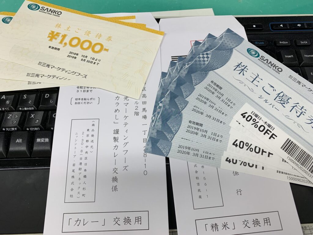今日届いた株主優待「三光マーケティングフーズ」▼株主割引券【シルバー】*6枚 20200325_154608 posted by (C)ミント専門官 この会社は本州でレストランなどを営業しており、その食事の割引券だが、北海道には店がないので、券を送り返すとカレーか米券... -
