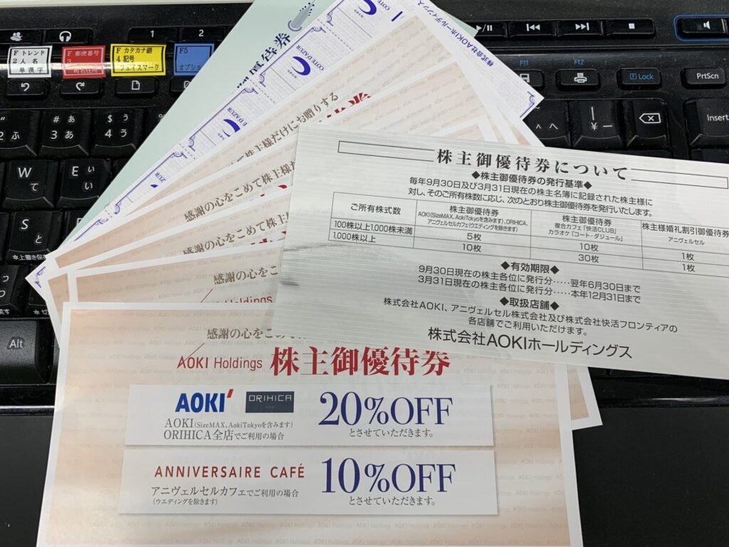 ▼初 20190608_224139 posted by (C)ミント専門官 株主優待の内容◎AOKI、ORIHICA、アニヴェルセルカフェで使えるお買い物優待券(20%割引)・100株 … 5枚◎コート・ダジュール、快活CLUBで使える利用料金優待券(20%割引)・100株 … 10枚◎アニヴェルセル各...
