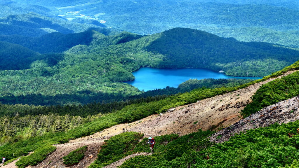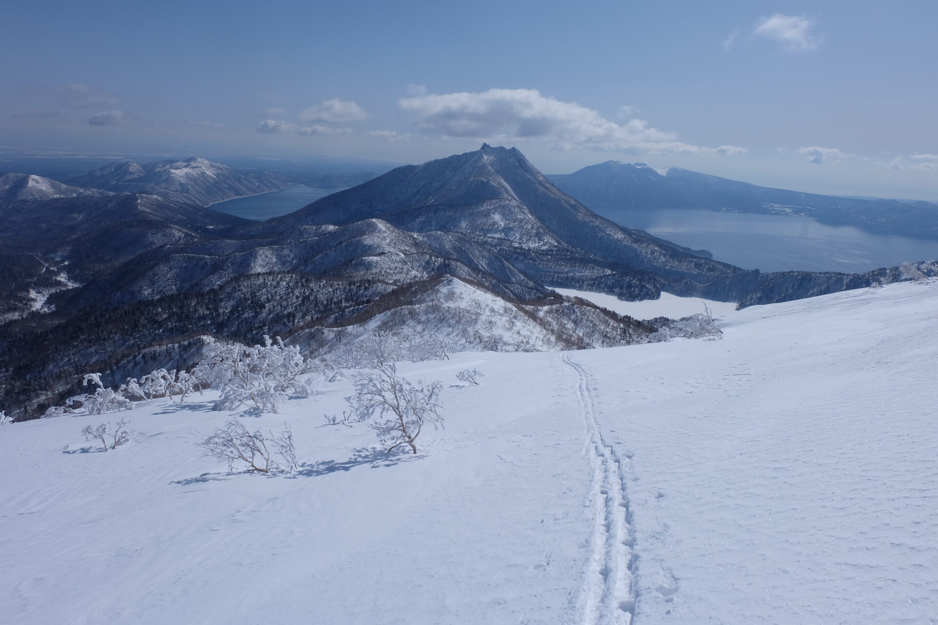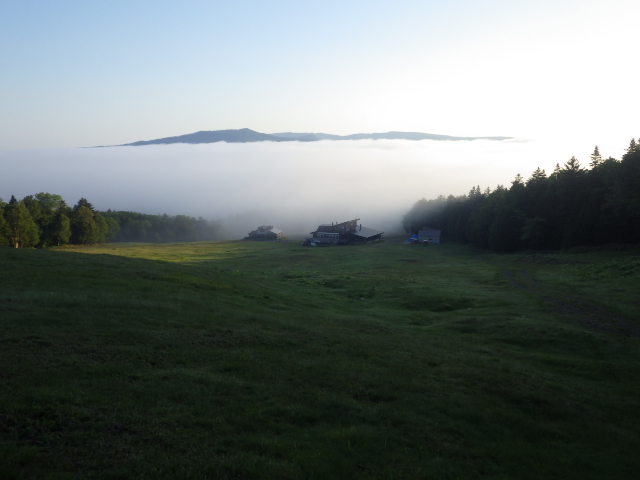 ▼P08 ゲレンデ途中で振り返ると感動!阿寒湖上は霧。