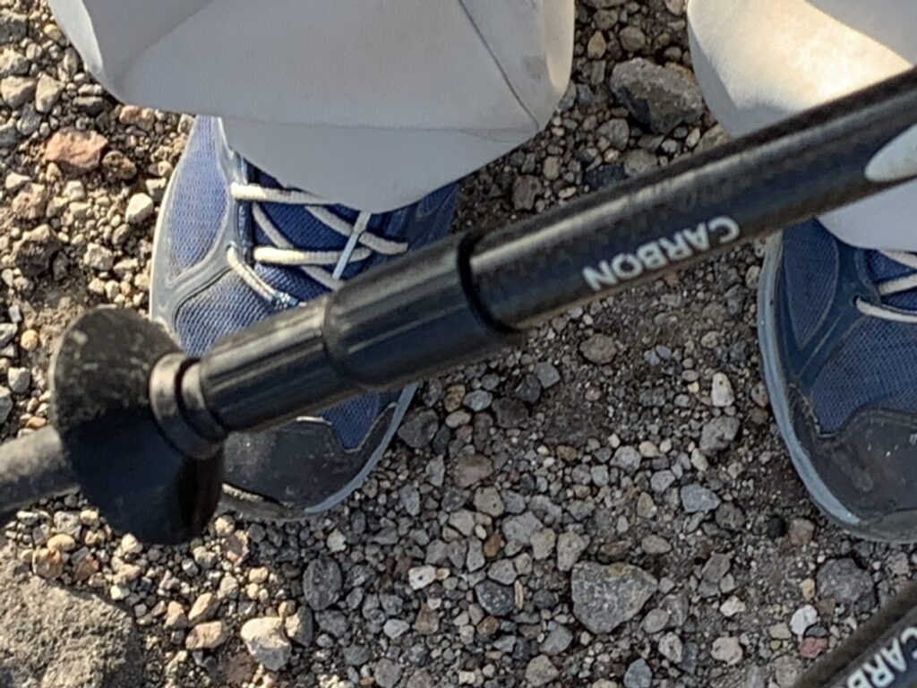 ▼作業服といつもの登山靴ではなくパームランドジョガー で登った。リュックなし、ポールのみ手持ち。