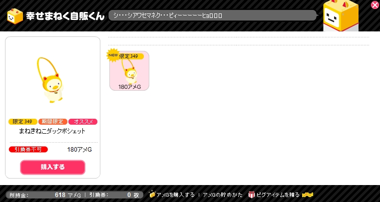 渋谷道玄坂17丁目の「まねきねこダック」 2010 10/20 SNSandHOMEPAGE アメピグ 2010年10月20日2025年10月26日 ▼「まねきねこダック」にふれると幸せになれるらしい(^o^) http://ameblo.jp/manekinekoduck-blog/ 20101019_214235 posted by (C)ミント専門官 ▼限定品の「まめきねこダックポシェット」を衝動買い 20101019_214324 posted by (C)ミント専門官 20101024_203236 posted by (C)ミント専門官 20101024_203356 posted by (C)ミント専門官 20101024_203339 posted by (C)ミント専門官 SNSandHOMEPAGE アメピグ 渋谷道玄坂13丁目のローソン&9丁目のサンリオショップ 床が無くなった(T_T)