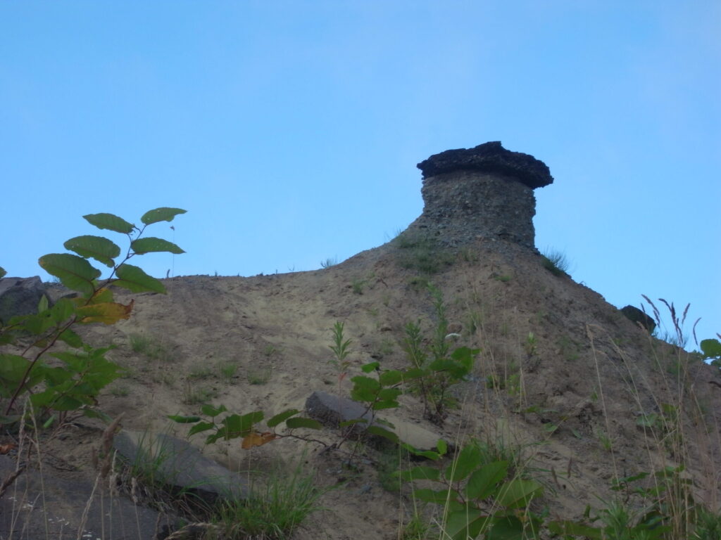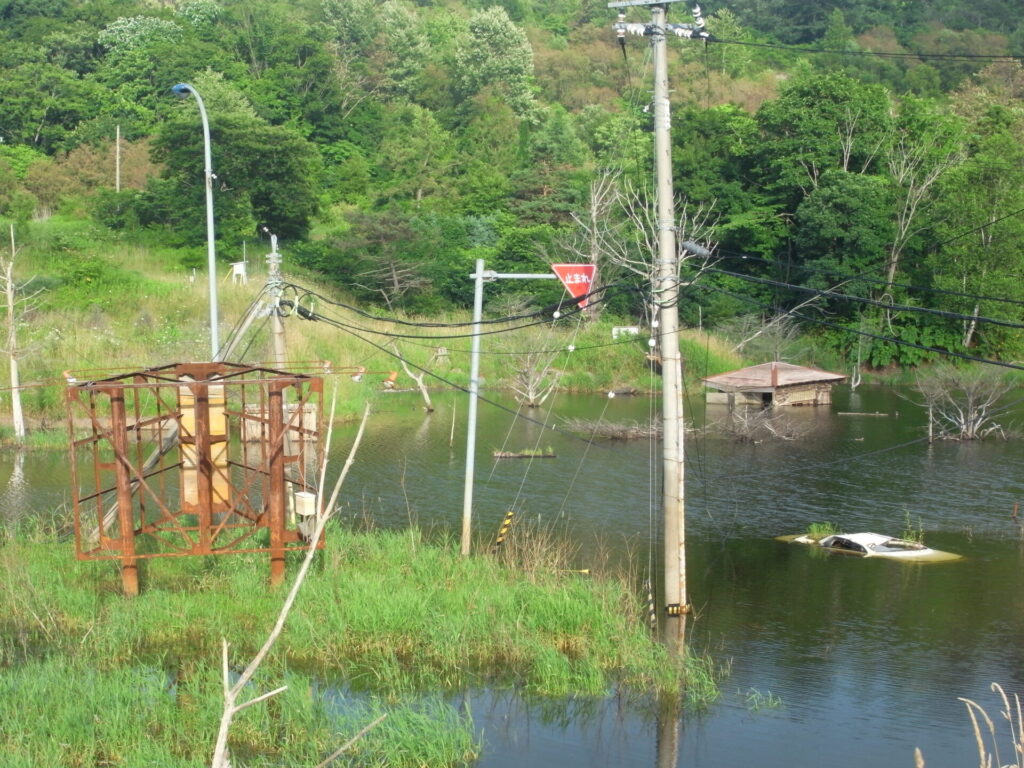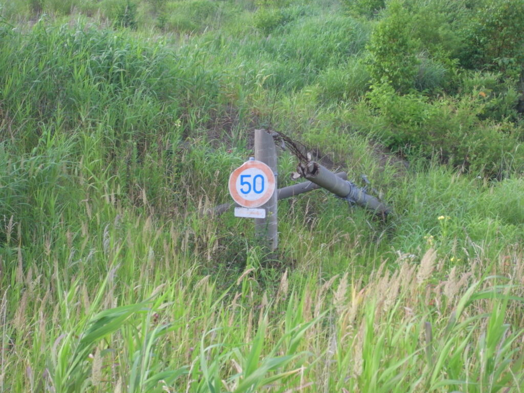 ▼舗装が雨をしのいで路盤が残っている不思議な光景 もとは道路があった証拠。