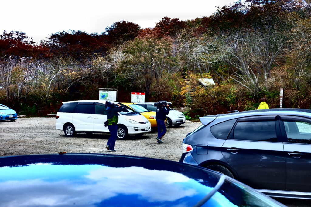 ▼樽前山の7合目ヒュッテに私の車を取りに行く。UHBが取材してた。