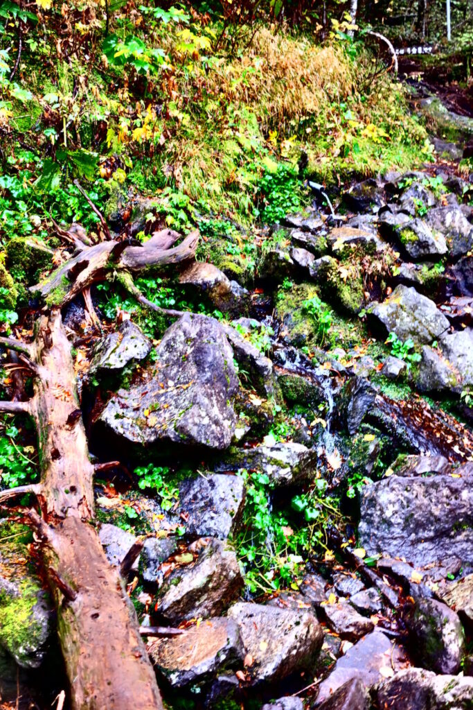 ▼6合目の一本橋。自信が無いので、石伝いに行く。