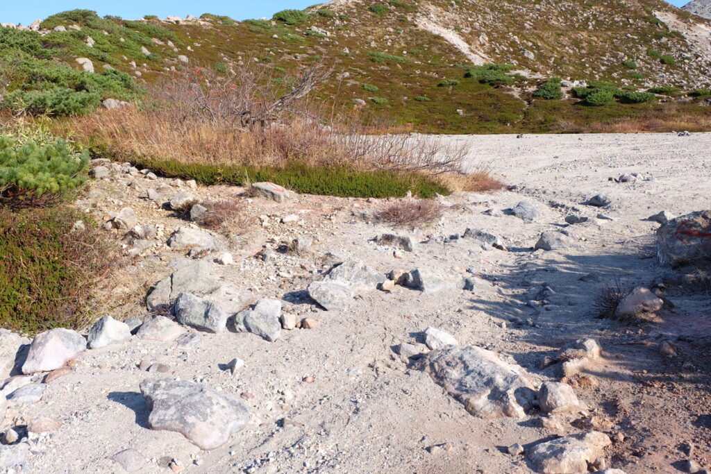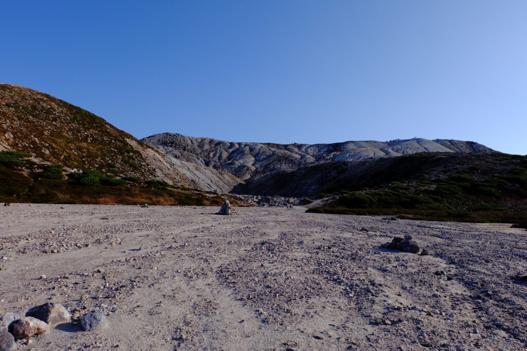 ▼月面のようなところに時計と反対まわりで到着。予定ではこちらから時計回りに山頂へ行くはずだった。