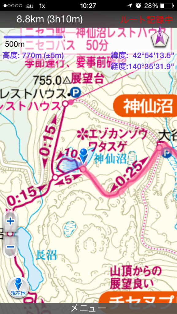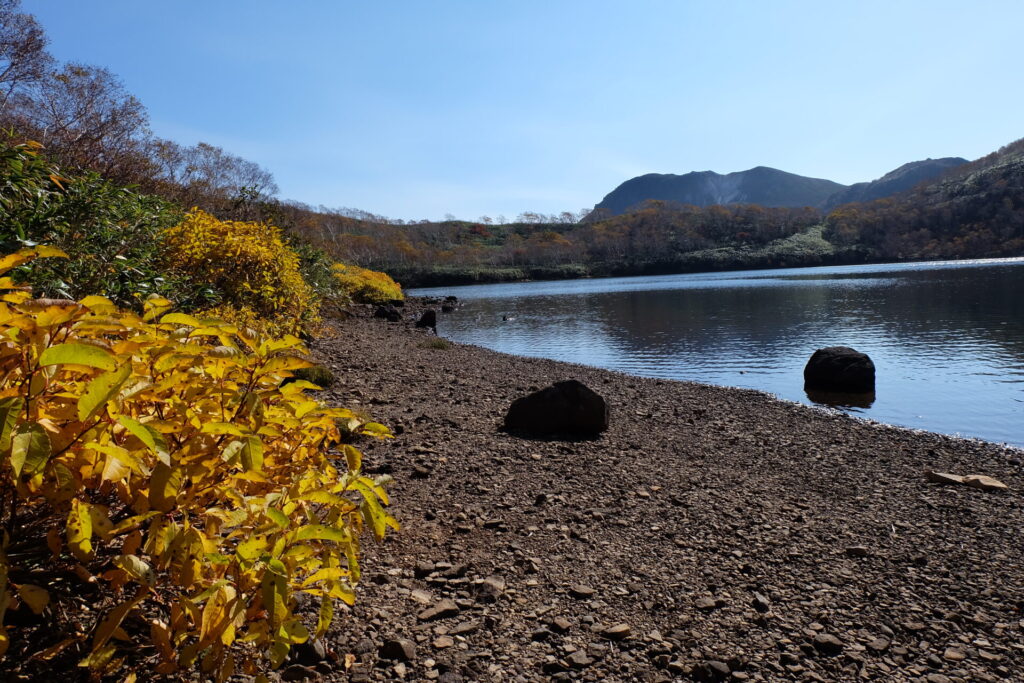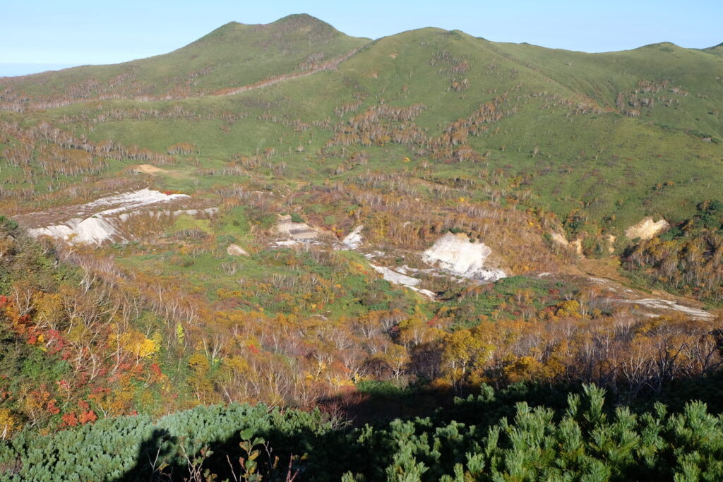 五色温泉郷-(45分)-イワオヌプリ-(45分)-鉱山跡-(30分)-大沼-(35分)-大谷地-(25分)-神仙沼-(15分)-神仙沼レストハウス-(路線バス20分)-五色温泉郷