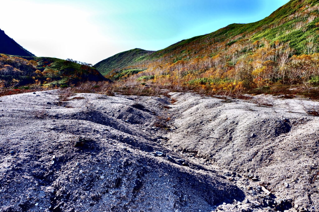 ▼硫黄の鉱山跡。ここも道が不鮮明。