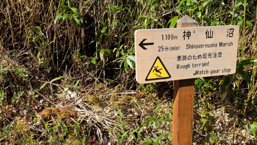 ▼「神仙沼」への案内看板。案内版に反して道は非常に良い。サンダルでも可。