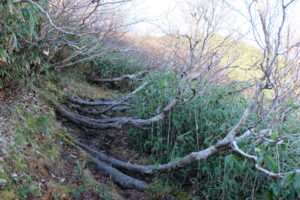 ▼頂上の先っぽに少し道らしきものが有るので下ってみる。