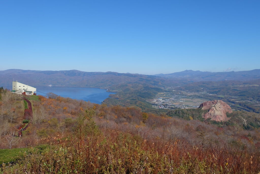 ▼洞爺湖と小有珠。遠く「ウインザーホテル」が見える。
