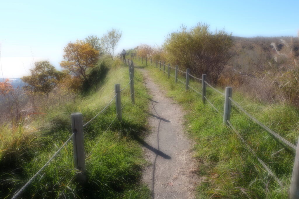 ▼外輪山遊歩道を戻る。観光客は、みなこの先が気になるのだろう、「いくとか、いけないとか、看板に登山装備は必要」と書いてあるとかワイワイ言っている。