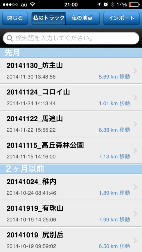 「やまやまGPS」のトラックデータを表示し、任意のデータを選ぶ。