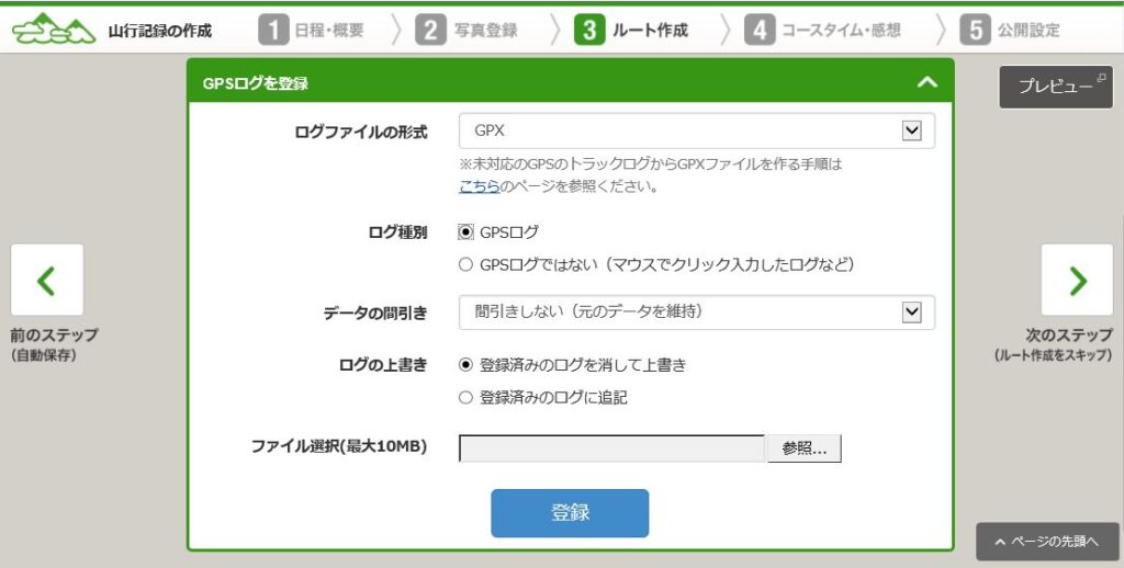 GPSログを選択し、DLしたデータを参照。「登録」をクリック。