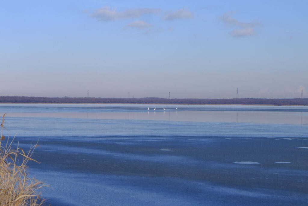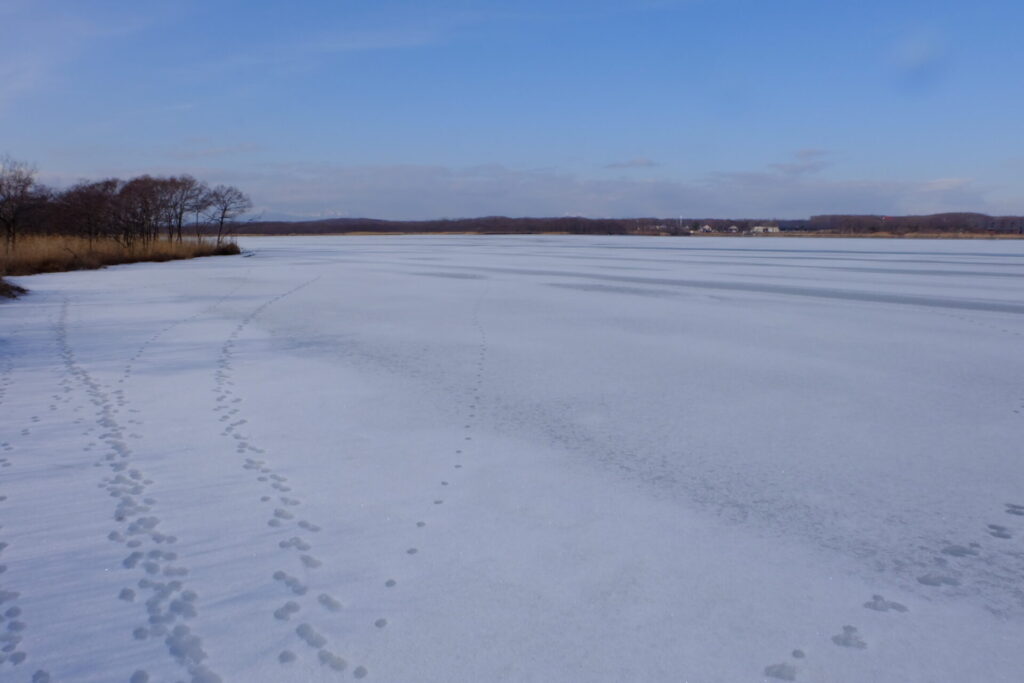 ▼道の駅と鳥獣保護センターがはっきり見えるまでになった。氷の上を歩く。