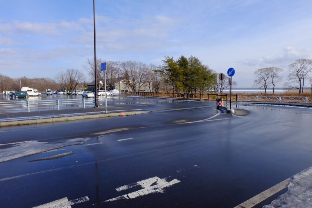 ▼観光客が必ず寄る道の駅の前の湖畔。湿地を歩いているとき、ここを目標にしていた。