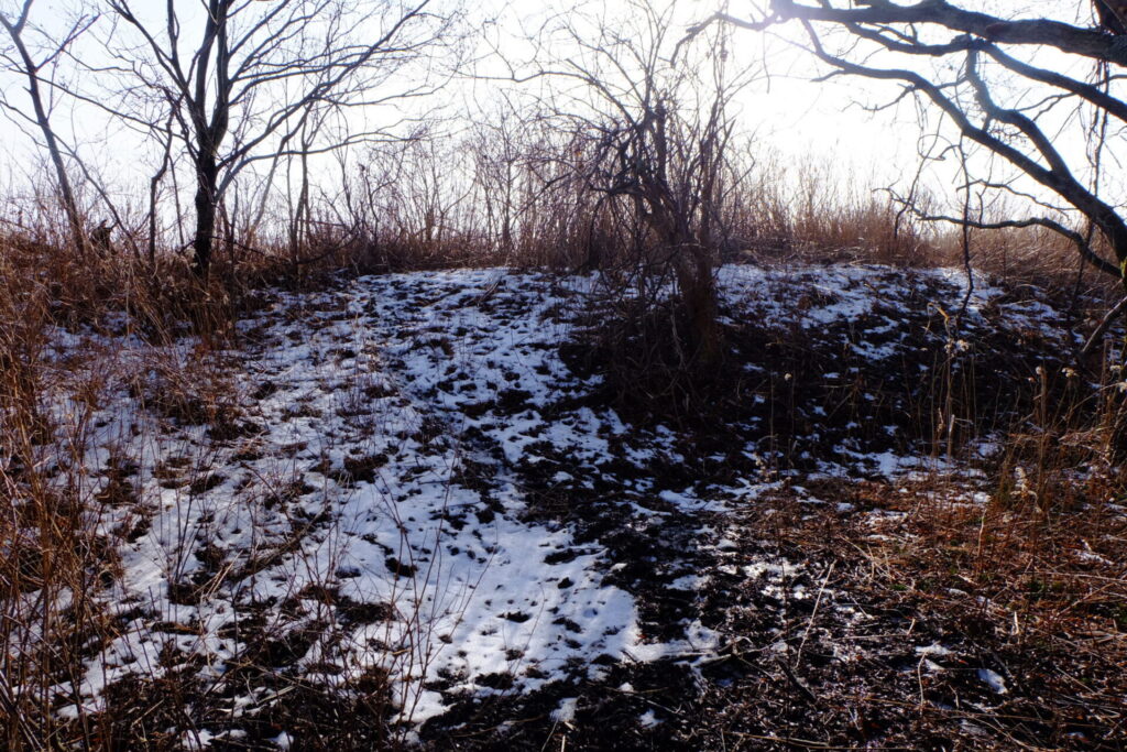 ▼植苗橋を渡ってすぐ左に曲がり湿地の方へ進む。道がよくわからないが獣の足跡があの坂を登っている。
