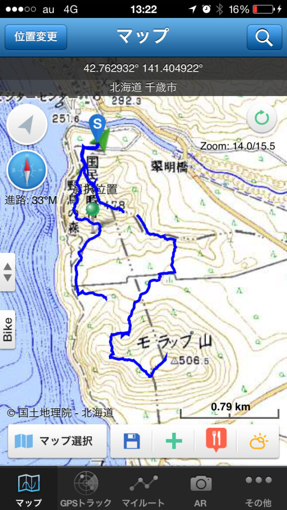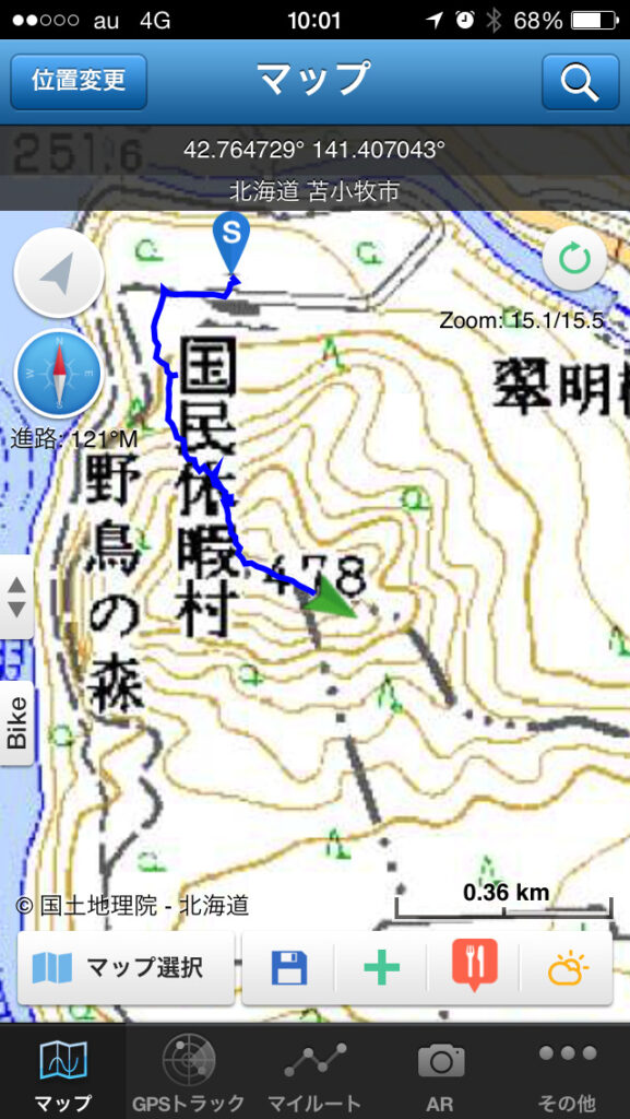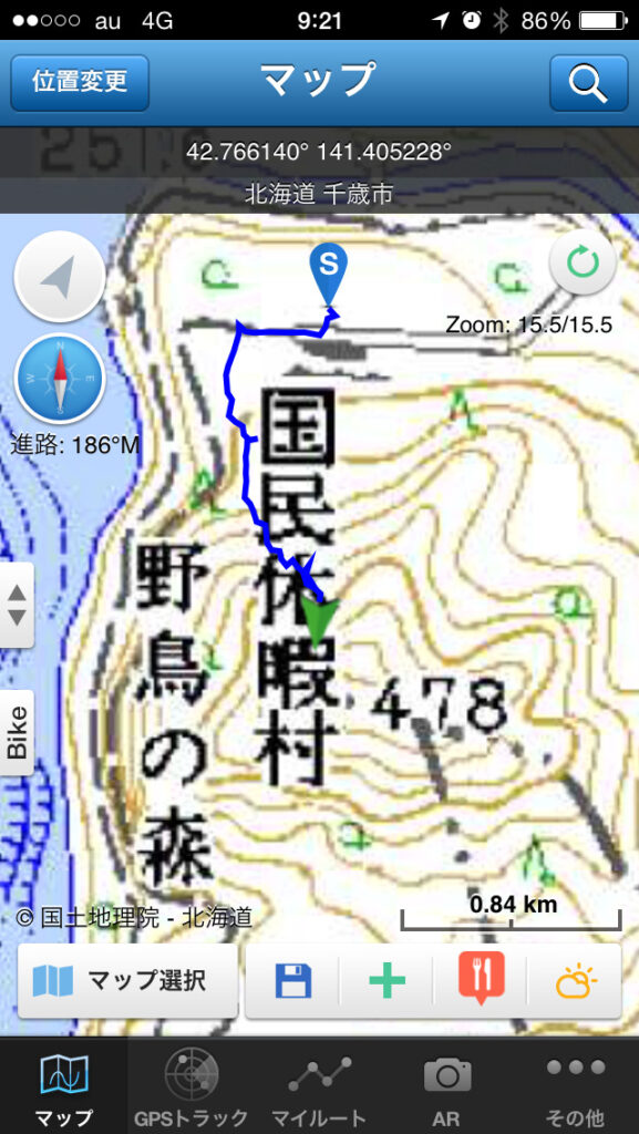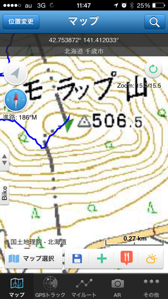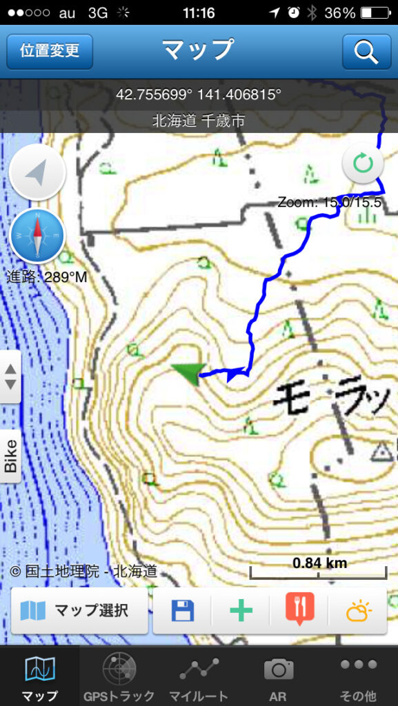 ▼林道に出た。一直線に支笏湖に向かう道路。そのまま行けば遊歩道にぶつかり最短距離でスタート地点に帰ることが出来る。モラップ山の登るかどうしようか迷う。