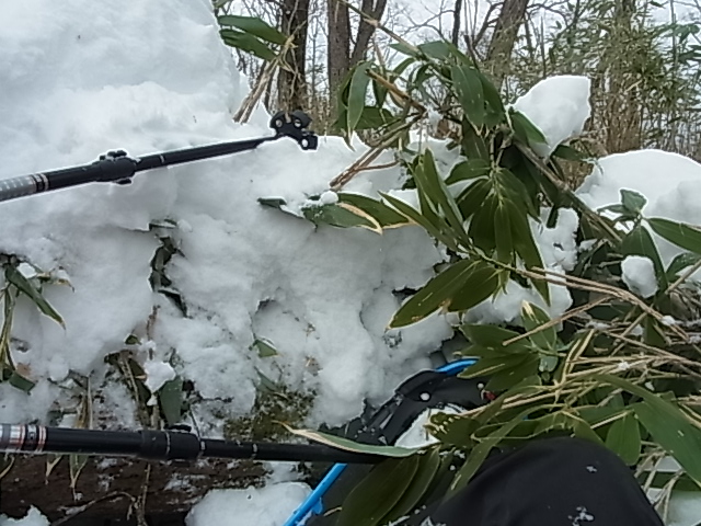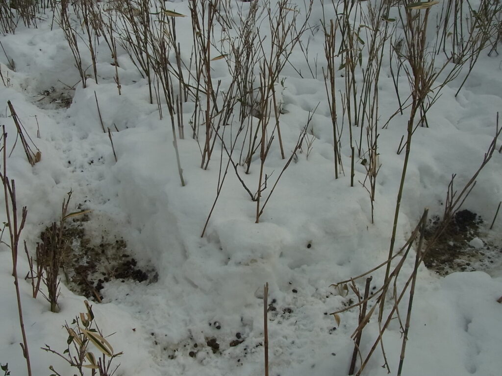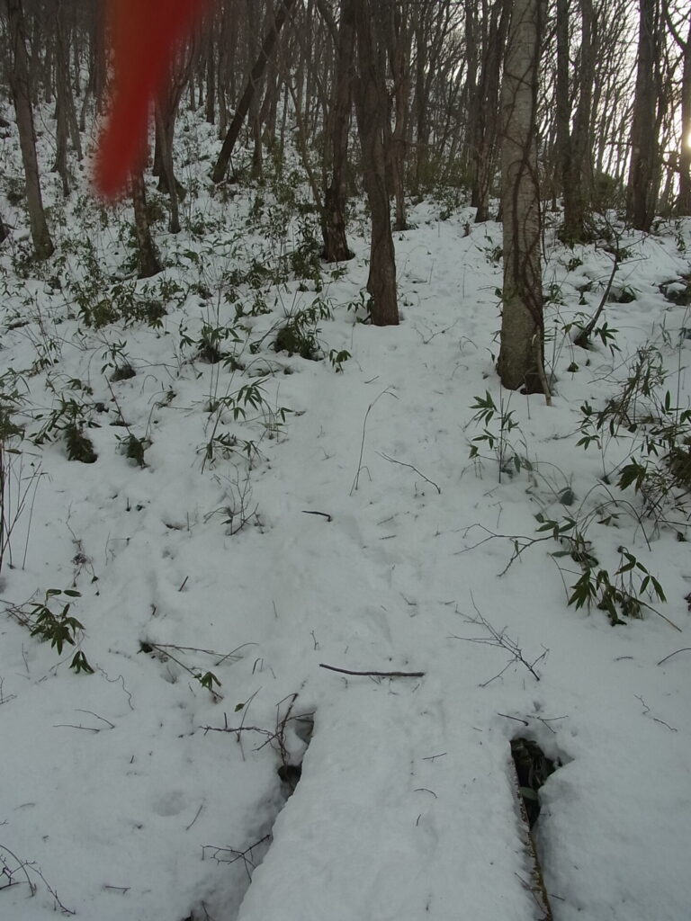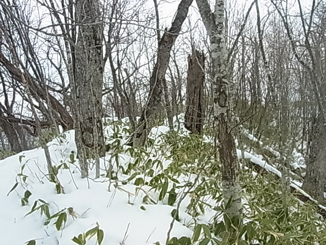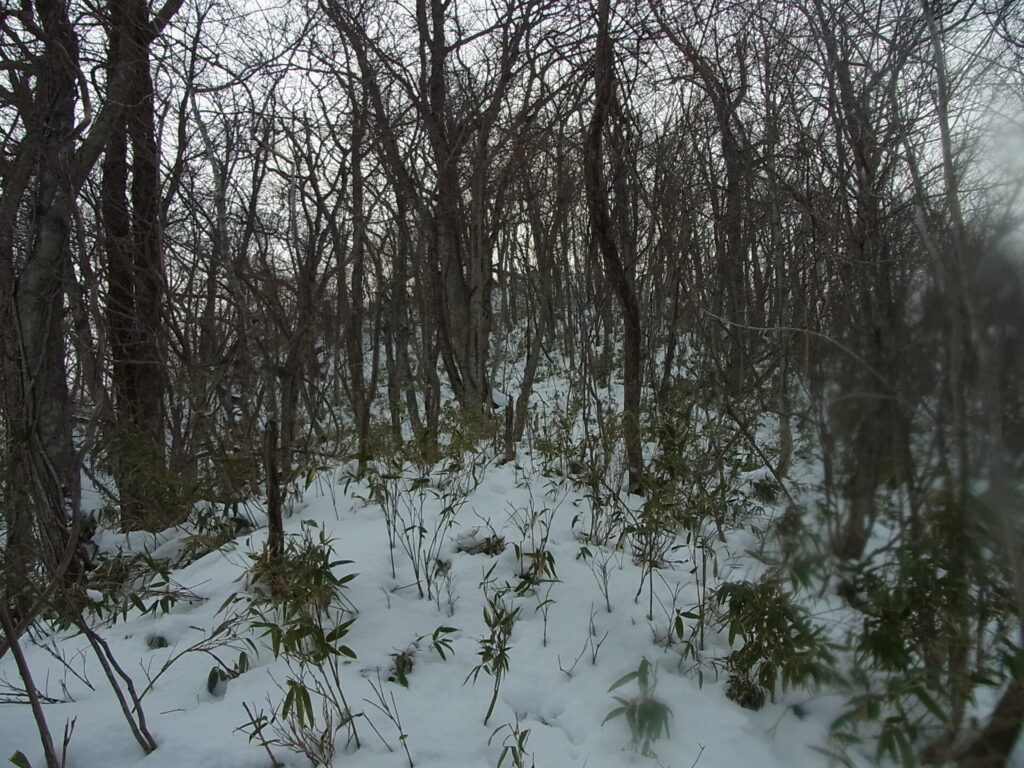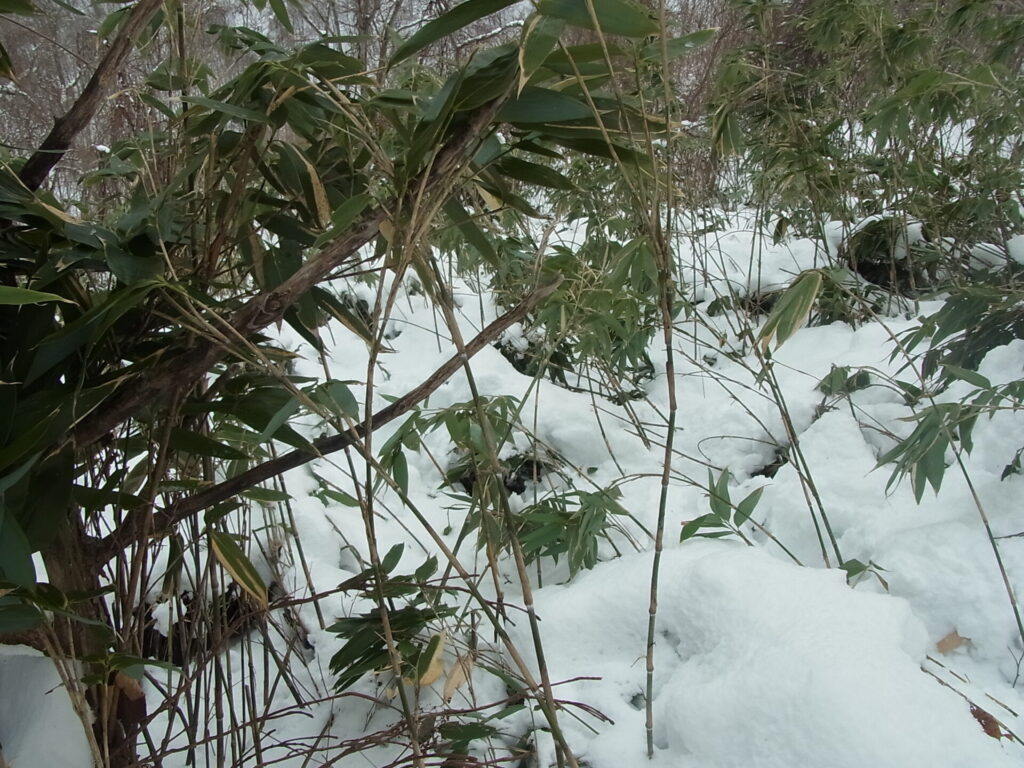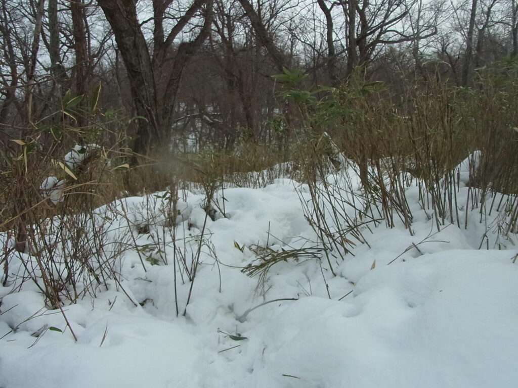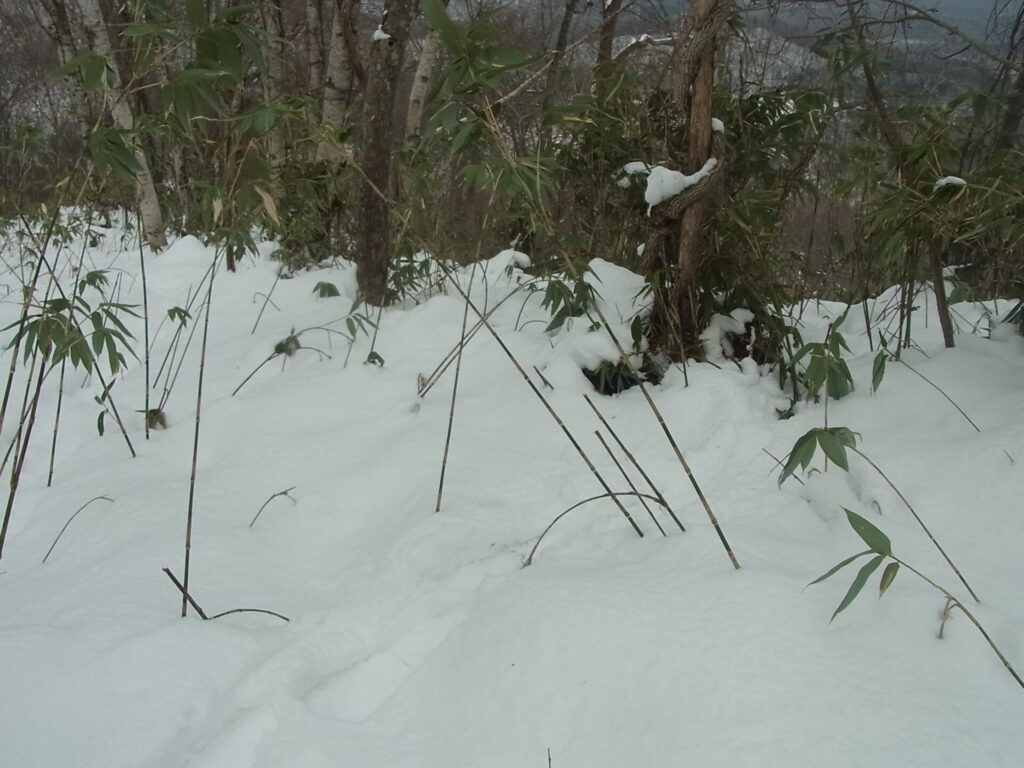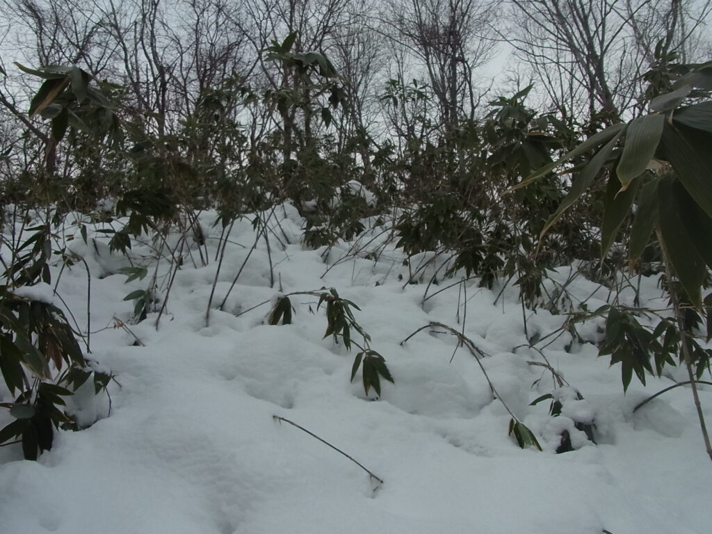 ▼この辺りは笹が多い。鹿の足跡が縦横無尽に有る。