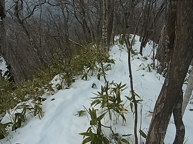 ▼少し登ったが、勾配が急でずり落ちてくる。笹もじゃま。