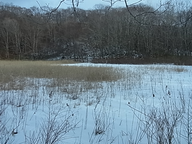 ▼森田沼の南の小さな池を探す。遠くで猟銃の音がするのでビビる。