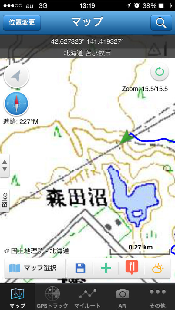 ここから、森田沼を一周するのに、沼の北側の谷を通らなければならないが、地形図からコンタを見ると相当に過酷そうだ。楽をするなら、一周をあきらめて南下して牧場の中を突き抜け整備された錦大沼の遊歩道を駐車場に帰ればよい。そのほうが最短距離で高低差もなく、ジャブジャブ水の中を行くこともない。