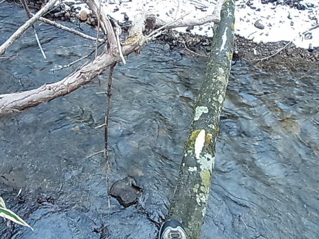 ▼小川にぶつかった。渡れそうなところは無し。なので、ジャブジャブ行く!
