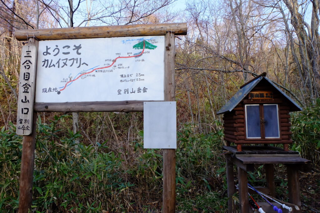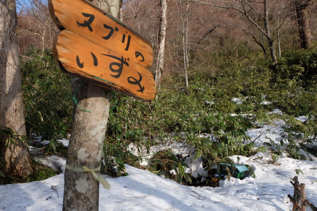 ▼登山口 アイゼンは持った。使わないだろうが、一応スノーシューも担いでゆく。
