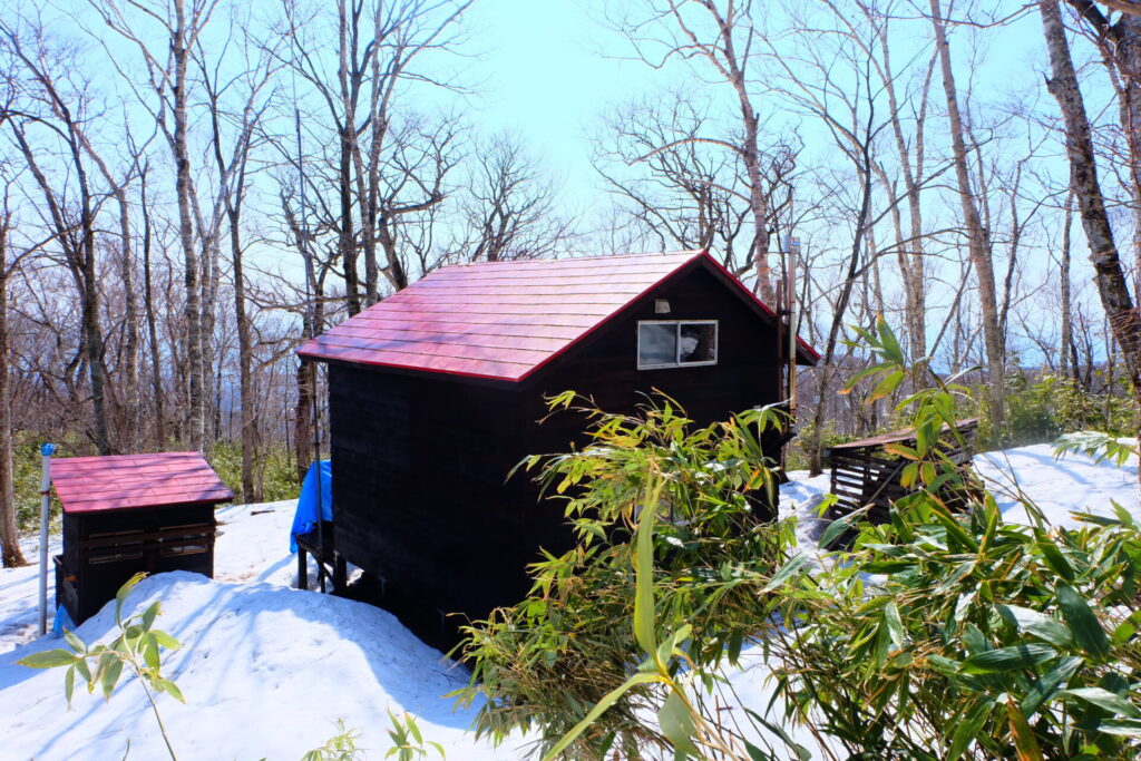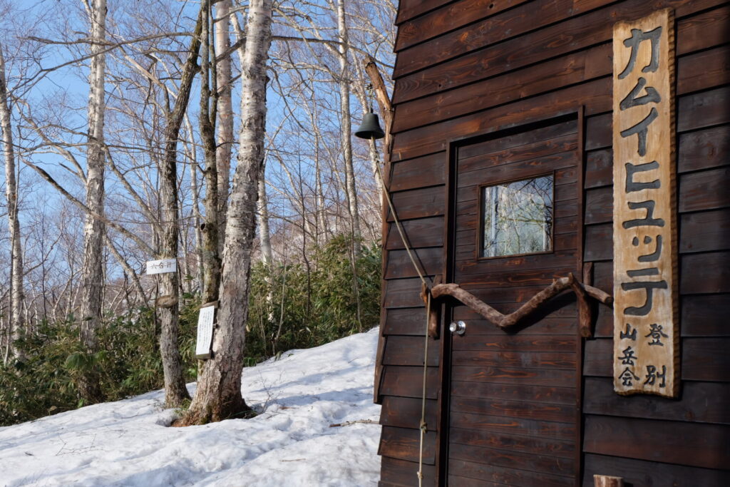 ▼カムイヒュッテに到着 暑いのでタイツを脱ぎ、アイゼンを装着する!