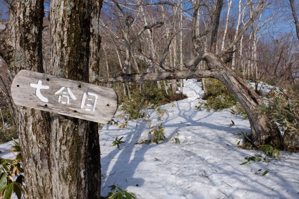 ▼鎖場を登ると七合目。また、スノーシューを履く。真横に伸びた木が印象的。