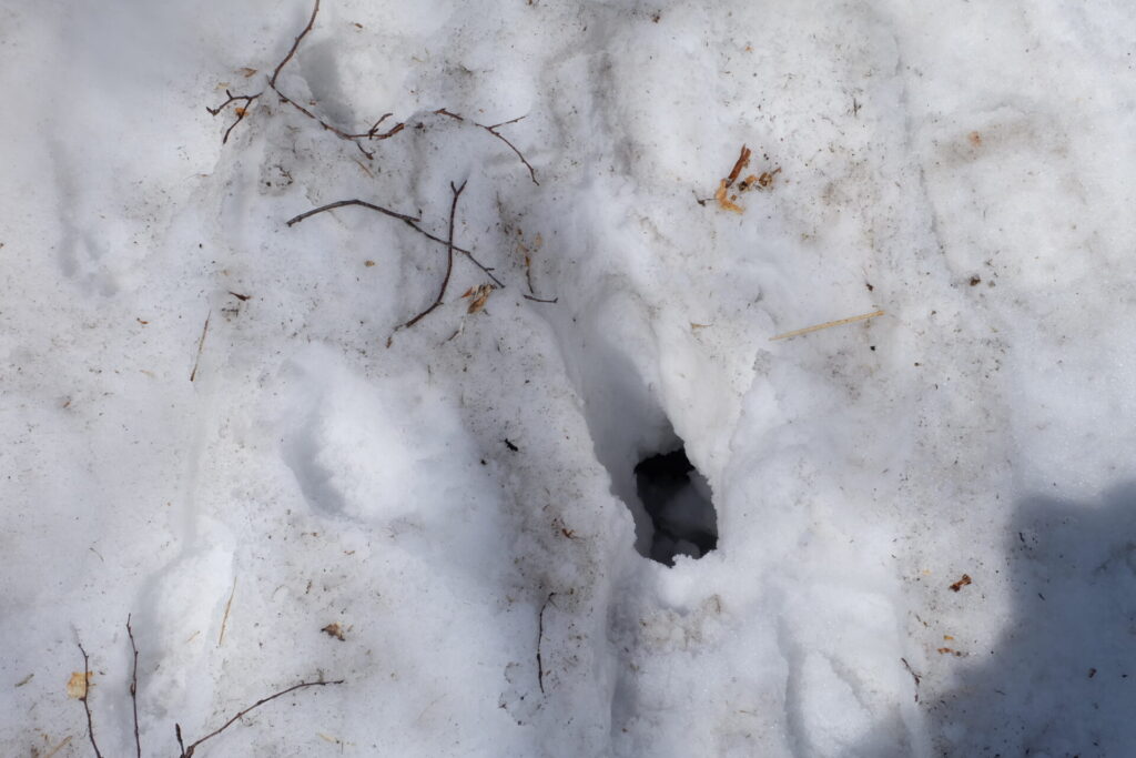 アイゼンを装着し100mも歩かないうちに、あまりの雪の多さに、アイゼンを断念![]()