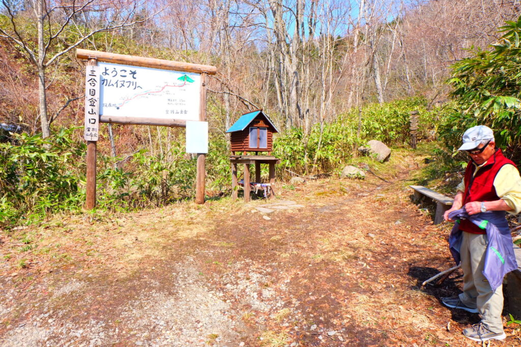 ▼登山口到着。道道から散歩で登ってきた老人と長話。