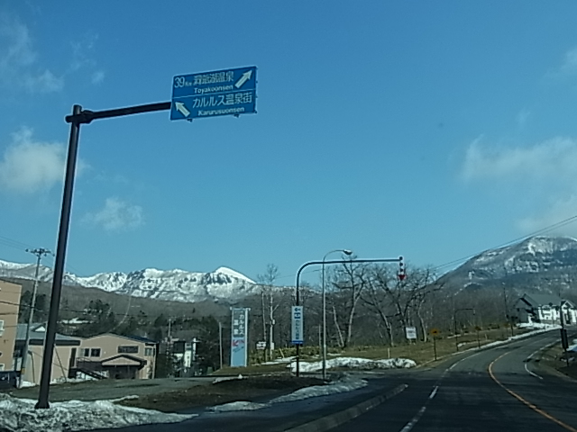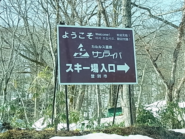 ▼登別からオロフレ峠に向かう途中のカルルス温泉の案内板で左折