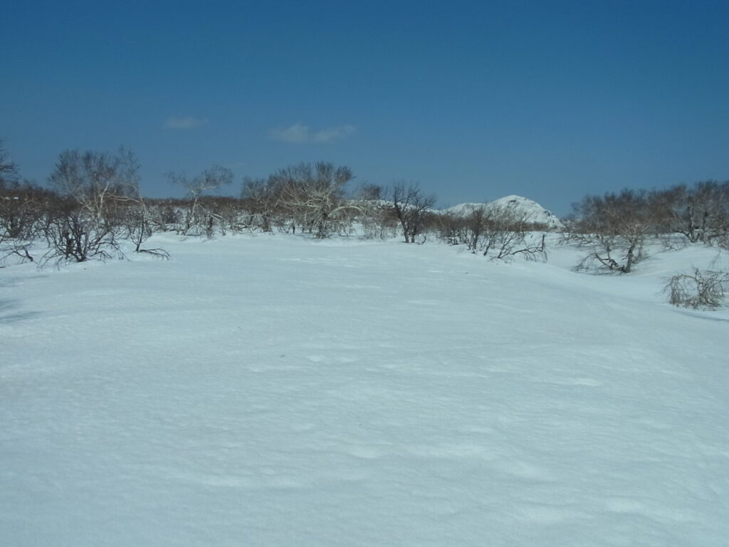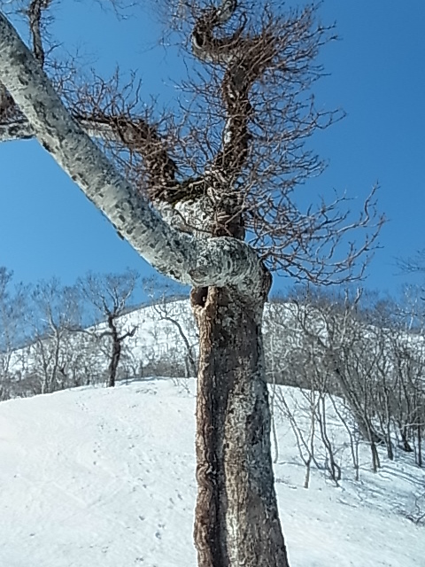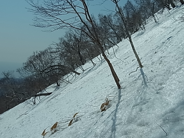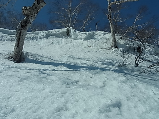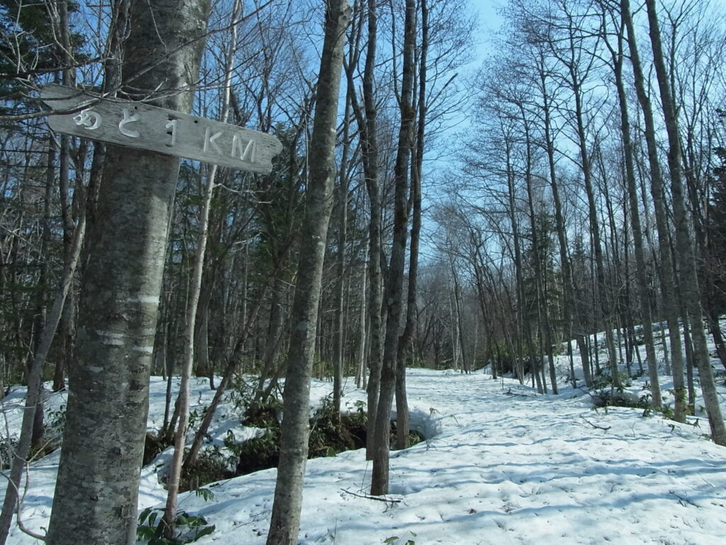▼地元の方がいた。地元の方曰く。「夏の登山道は、勾配がきつくて冬は登らない。スキー場を来るなら南回りでトラバースして緩い斜面を登る。」 どおりで、登山道にトレースが無いなーと思った。