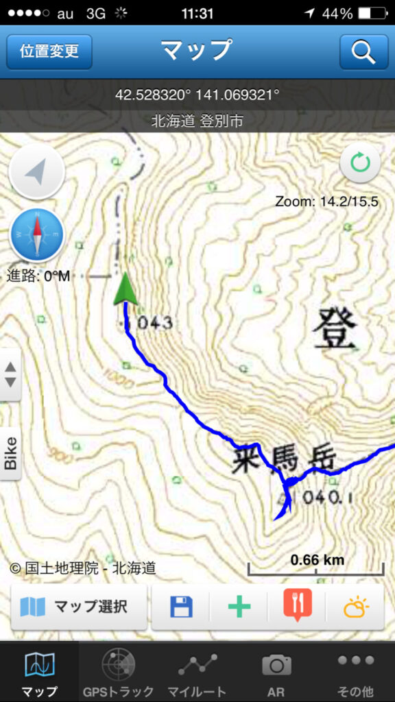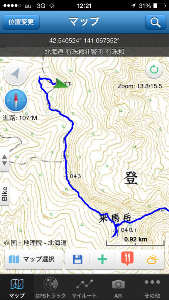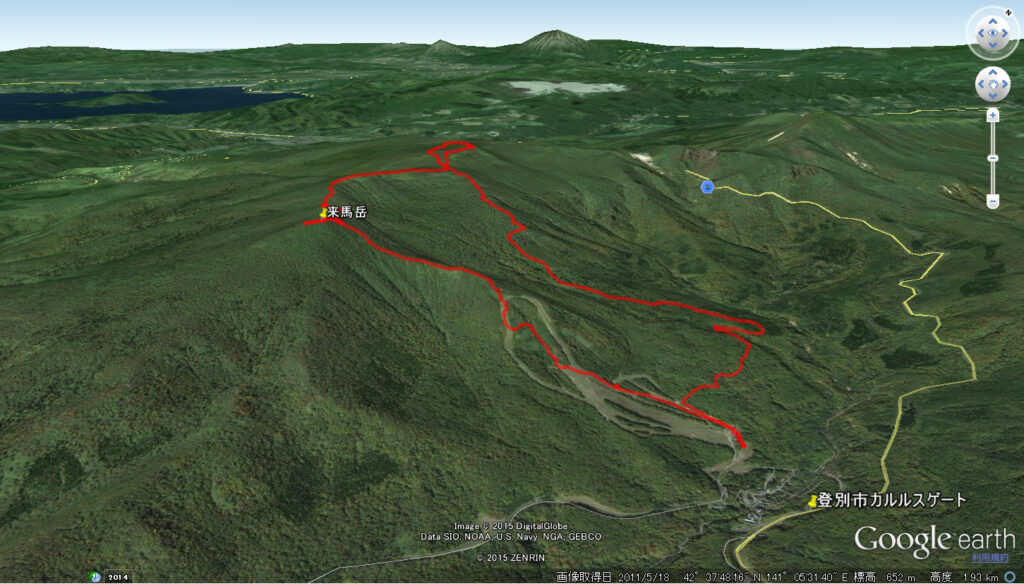 この大地に左手にカルルス山(1075m、壮瞥町、国立公園内、標柱なし?)、右手にバケモノ山(1077m、登別市、公園外)