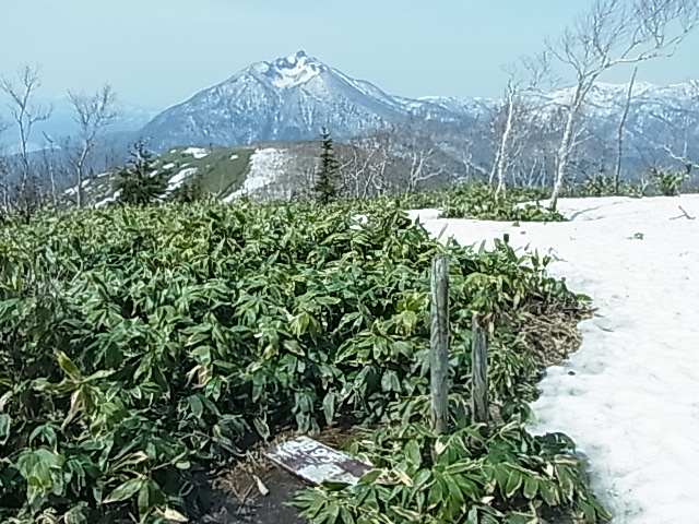 ▼反射台のところまで来たが...撤去されたようだ。ふり帰って恵庭岳。歩いて来た稜線もはっきりわかる。