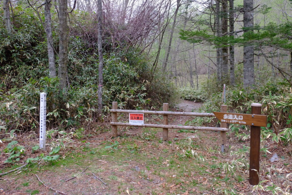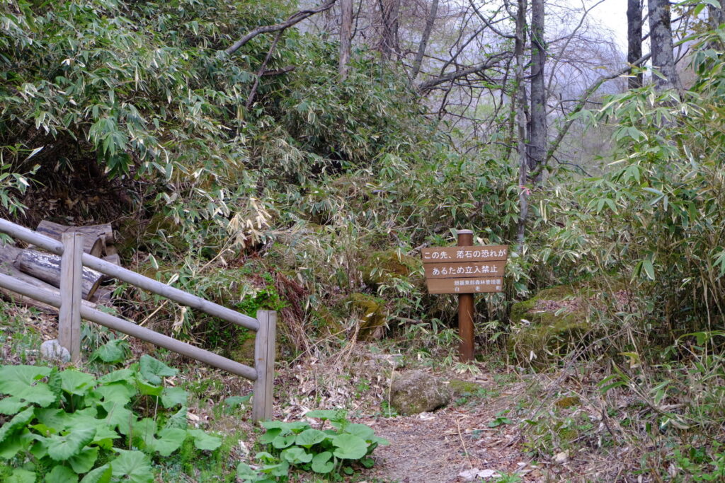 ▼駐車場(トイレ有)脇の散策路を行くと、いきなり路が流されていた。少し先の展望台に車を止め直し、散策路を進む。