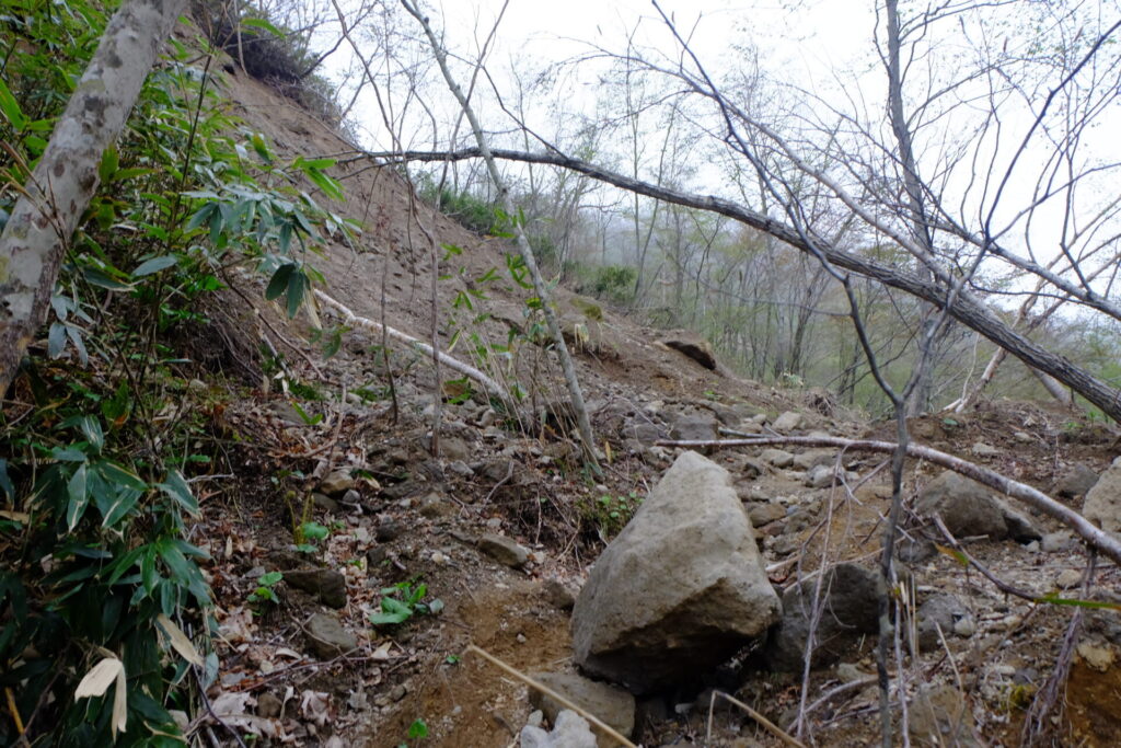 ▼土砂崩れ。避けて進む。