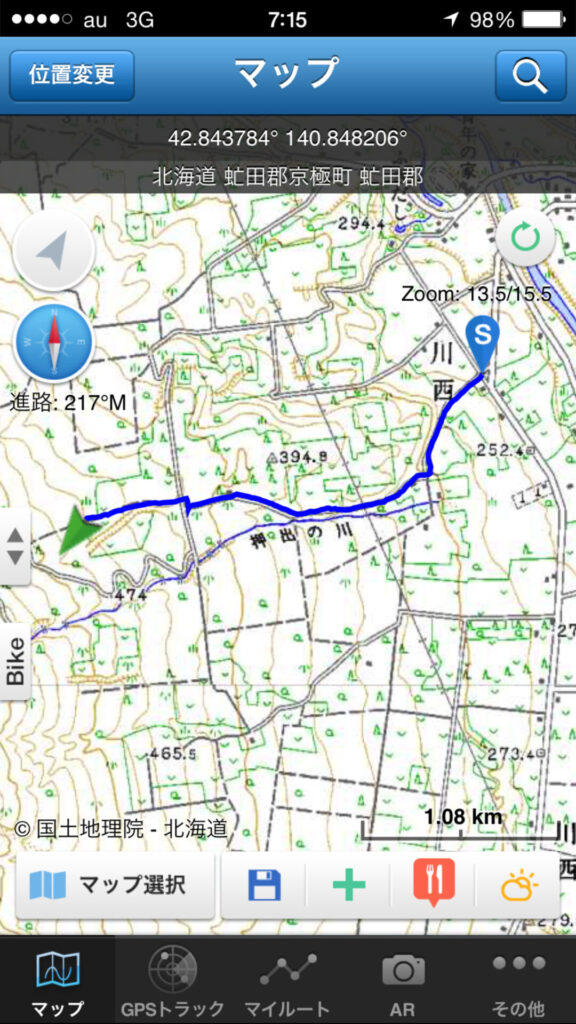 ▼位置の確認。京極登山口に向かってチャリを押し歩き中。