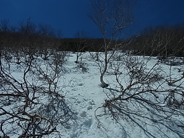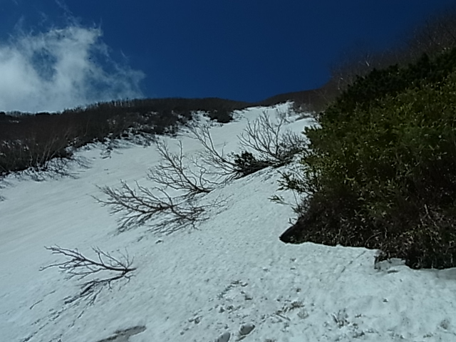 足跡を見失い。アイゼンの爪を一歩一歩、法にめり込ませながらチョビチョビ登る。