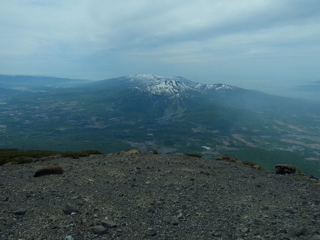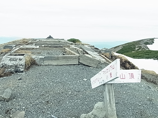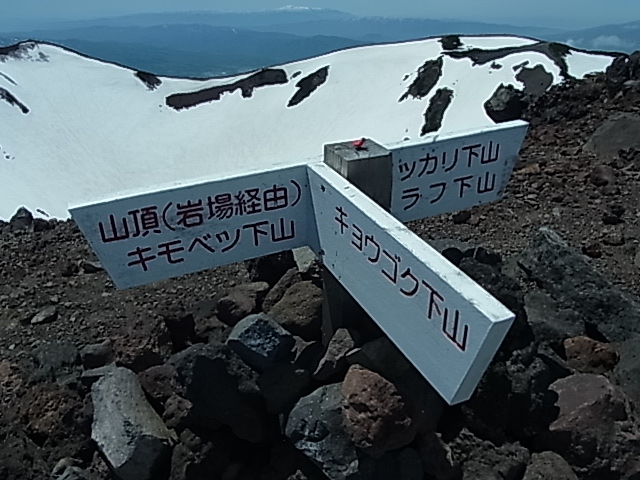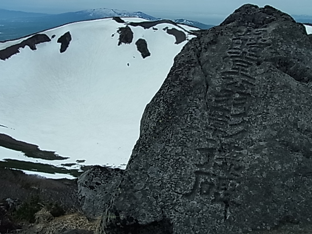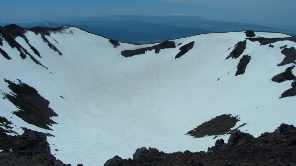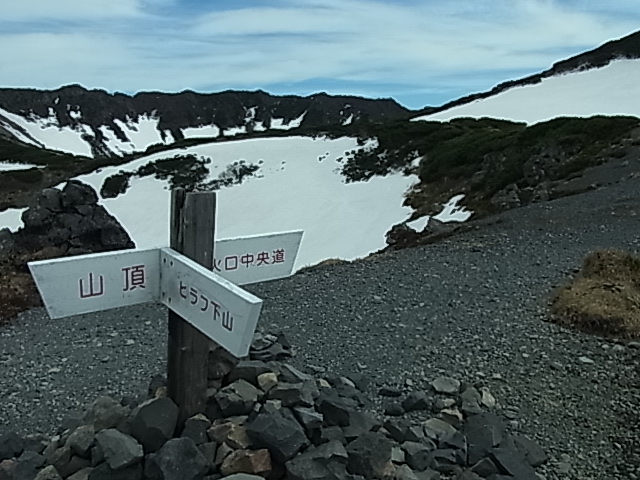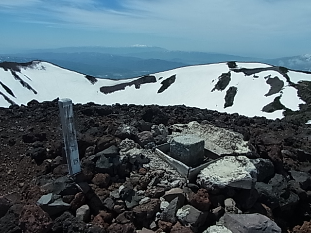 ▼山頂に着いた!夏道なら4時間強と予想していたが、迷ったり残雪のおかげで5時間ちょっとかかった。他の登山者と雑談。父釜を一周してみる。
