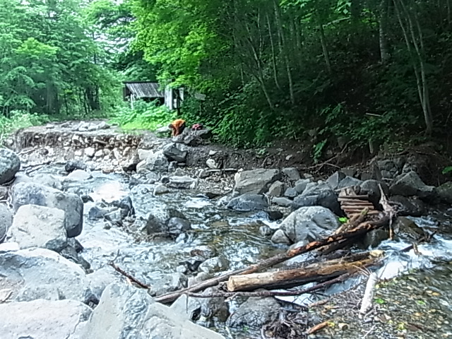 ▼記帳すると、すぐに渡河が待っている。泥だらけになると思われるので、スパッツを持っていないナチュラルUにドン・キホーテで買ってきたくらい安い蒸れ蒸れになるカッパの下をはかせる。