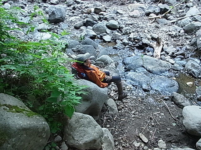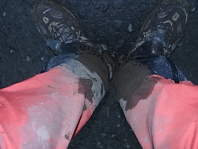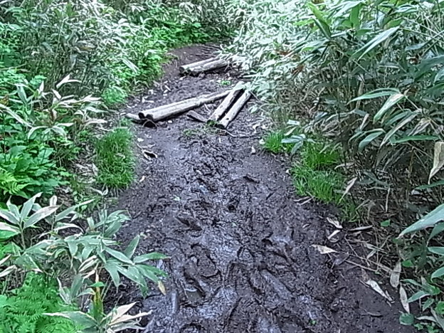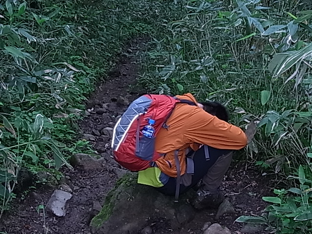 ▼万計山荘まで2.3km ナチュラルUの電池切れが目立ってきた。汚れても仕方がないが、カッパの下を脱がせる。上に4枚も着込んでいた。これも脱がせる。