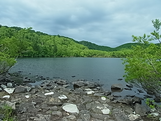 ▼真簾沼。ペンキを塗ったかのような部分的に白い石が印象的。