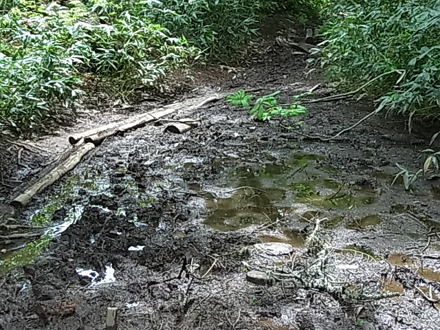 ▼すごい泥の中を転びながら下りて、沼を見た。