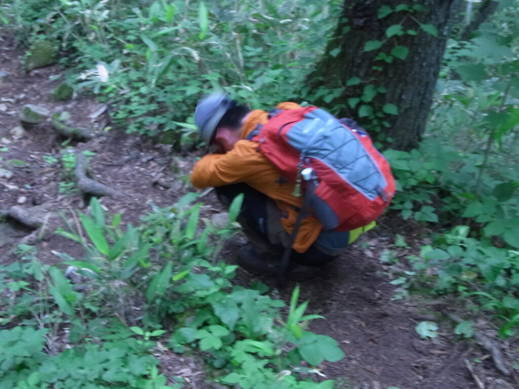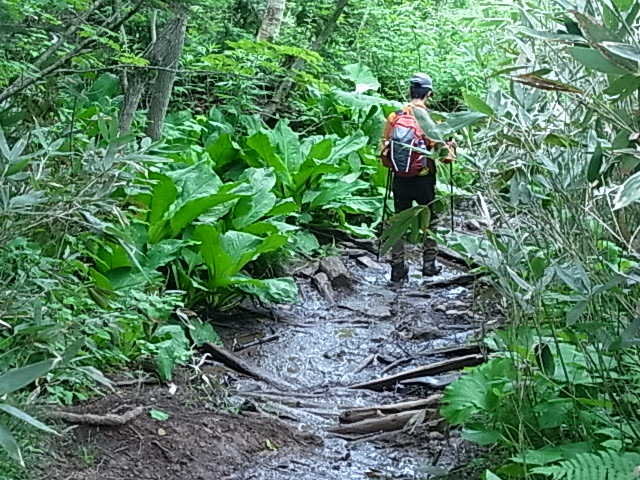 ▼札幌岳まで標準で4時間を進むには、ひどい登山道だ。15分進んでナチュラルUには無理と判断!無理をしないで引き返す。ストックとグローブを貸してやる。