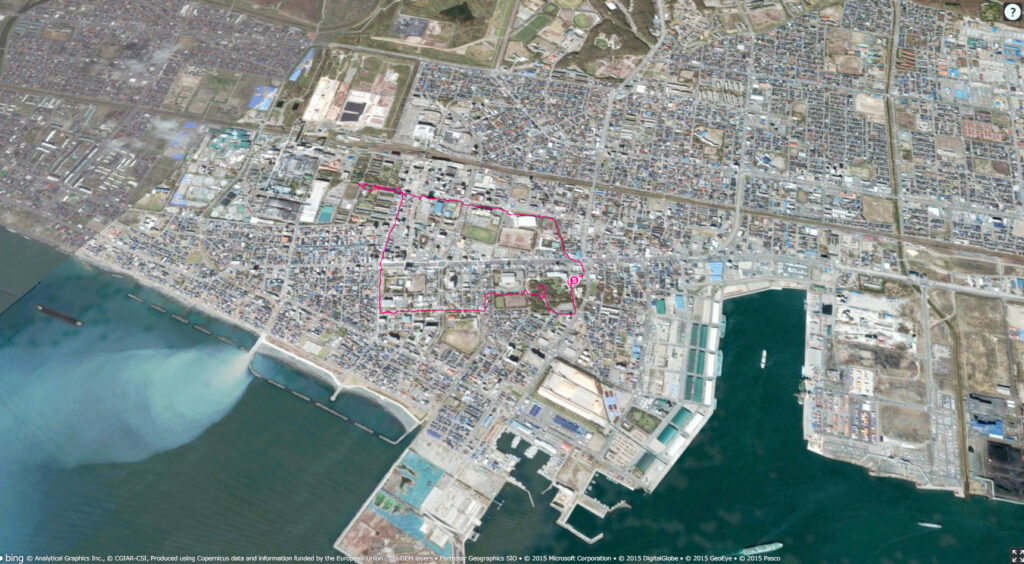 ▼王子製紙苫小牧工場の入口から市街中心部方向、樹木が多い!