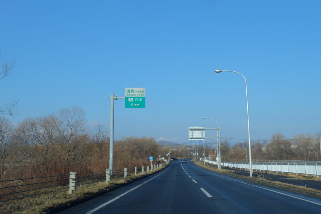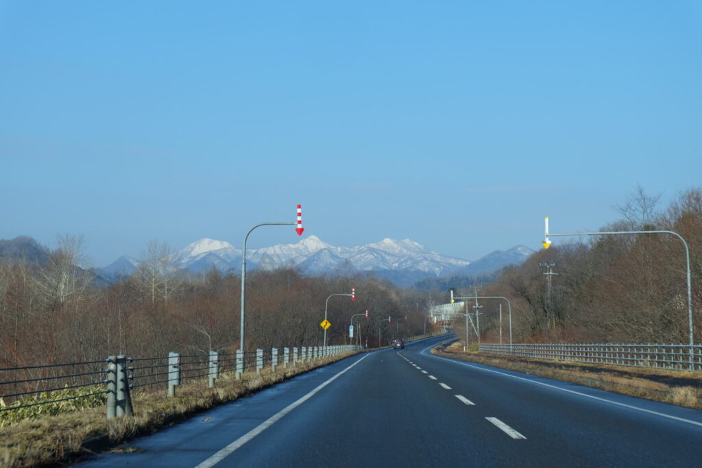 ▼ほぼ二か月ぶりの登山。しかも冬山とくるから、車の中なから緊張している。白老インターのあたりから目指す白老岳あたりが見える。