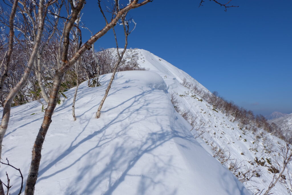 ▼頂上が近い!右は雪崩地形なので、左から攻める。