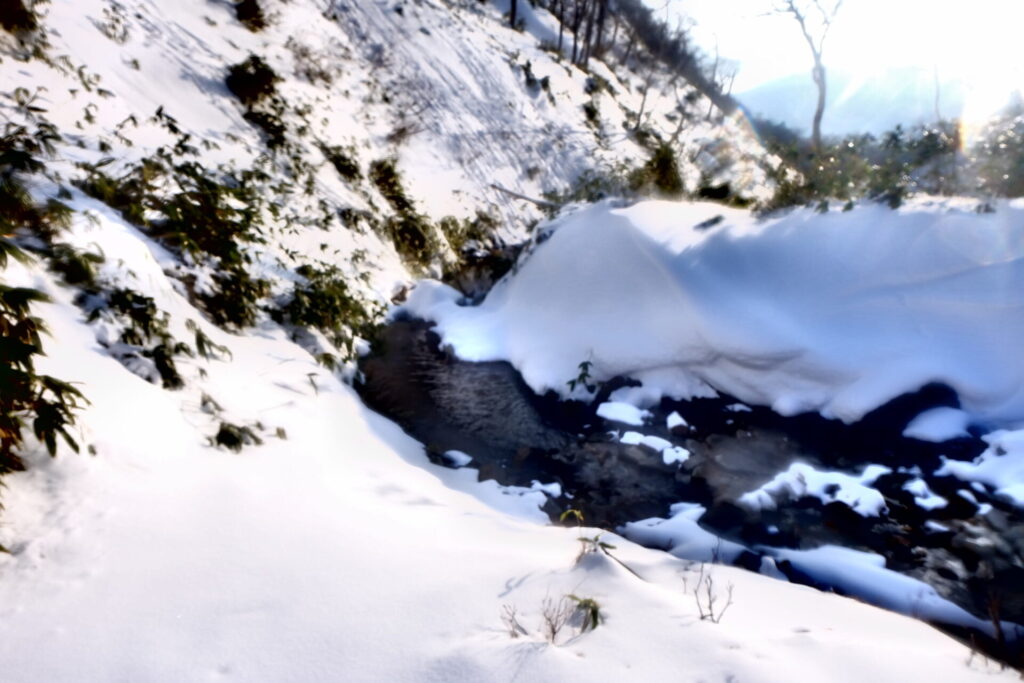▼もう、開きなおり!スノーシューを脱ぎ、ジャバジャバと沢を歩く‼️