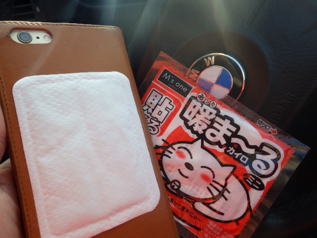 ▼本日の気温はマイナス5度。携帯にカイロを貼る。